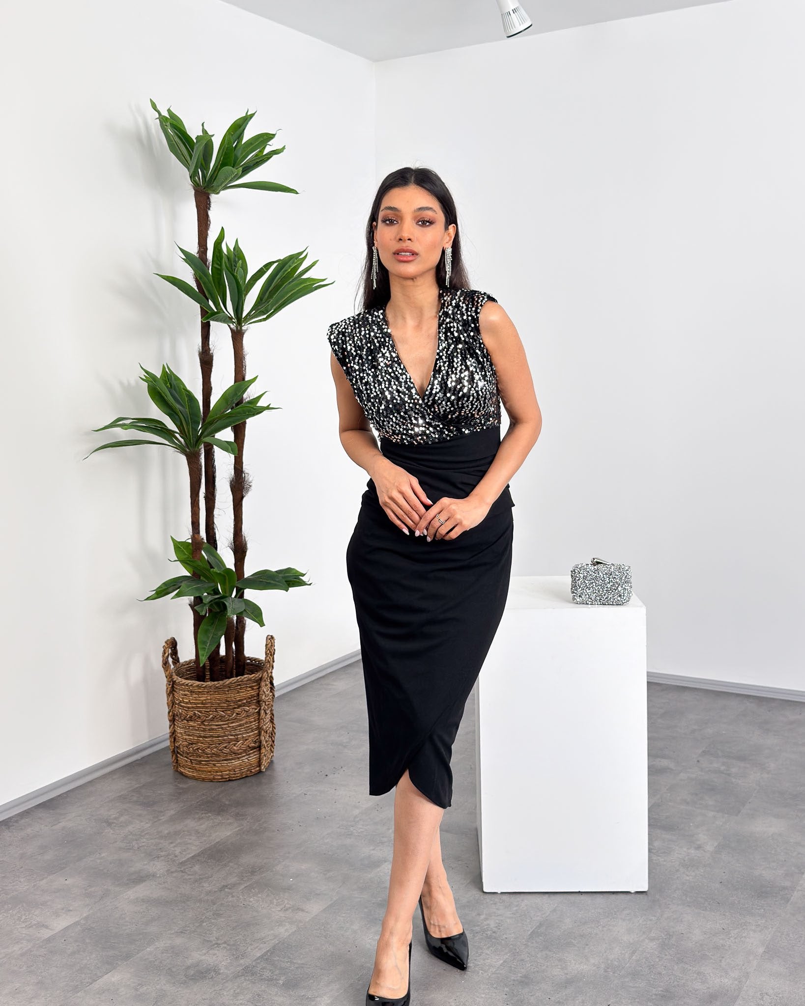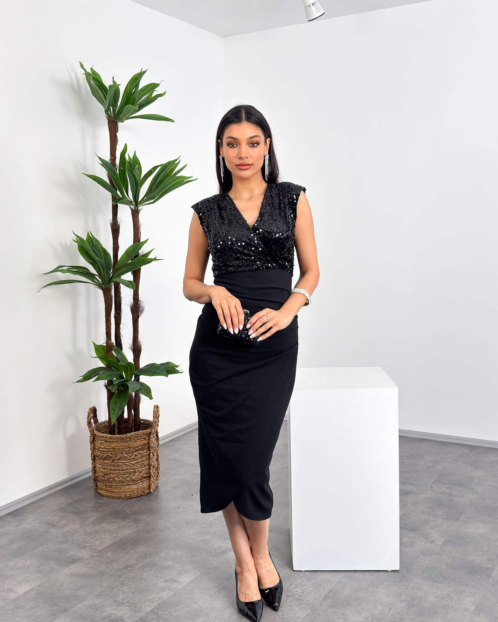 Feminine elegance meets shimmering details. This midi dress stands out with its wrap neckline, padded shoulders, and front draped skirt...