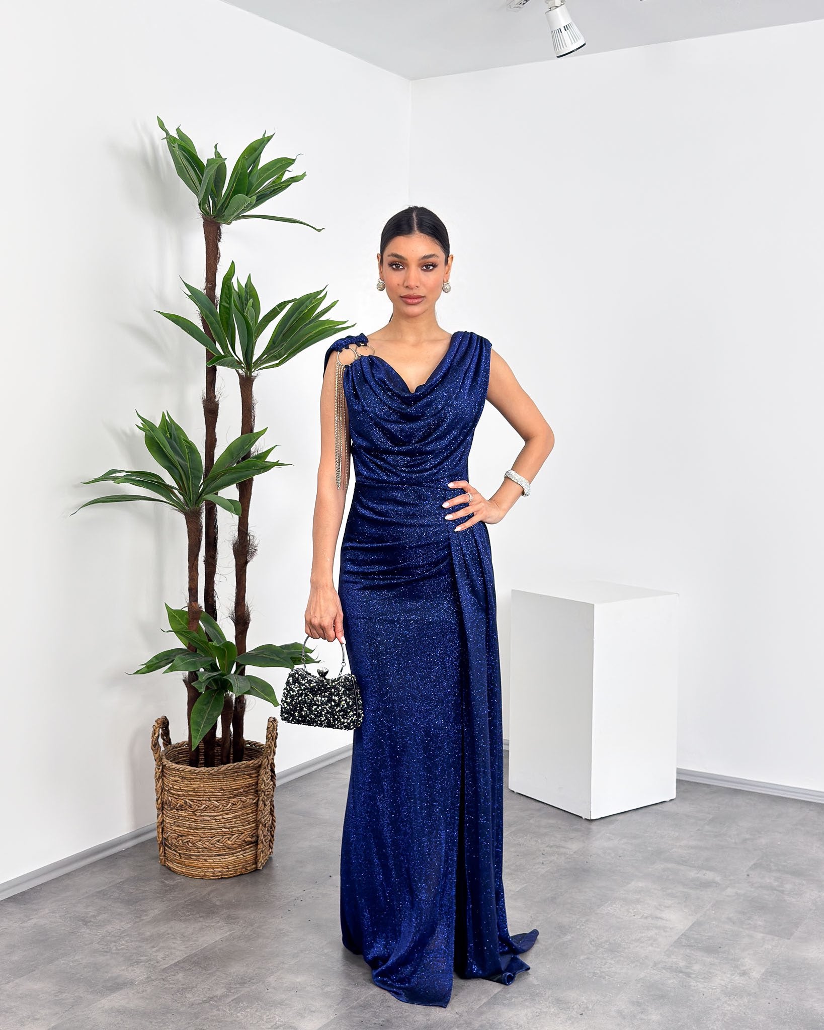 ML26004 Glitter Maxi Evening Gown with Draped Neckline and Shoulder Accessories