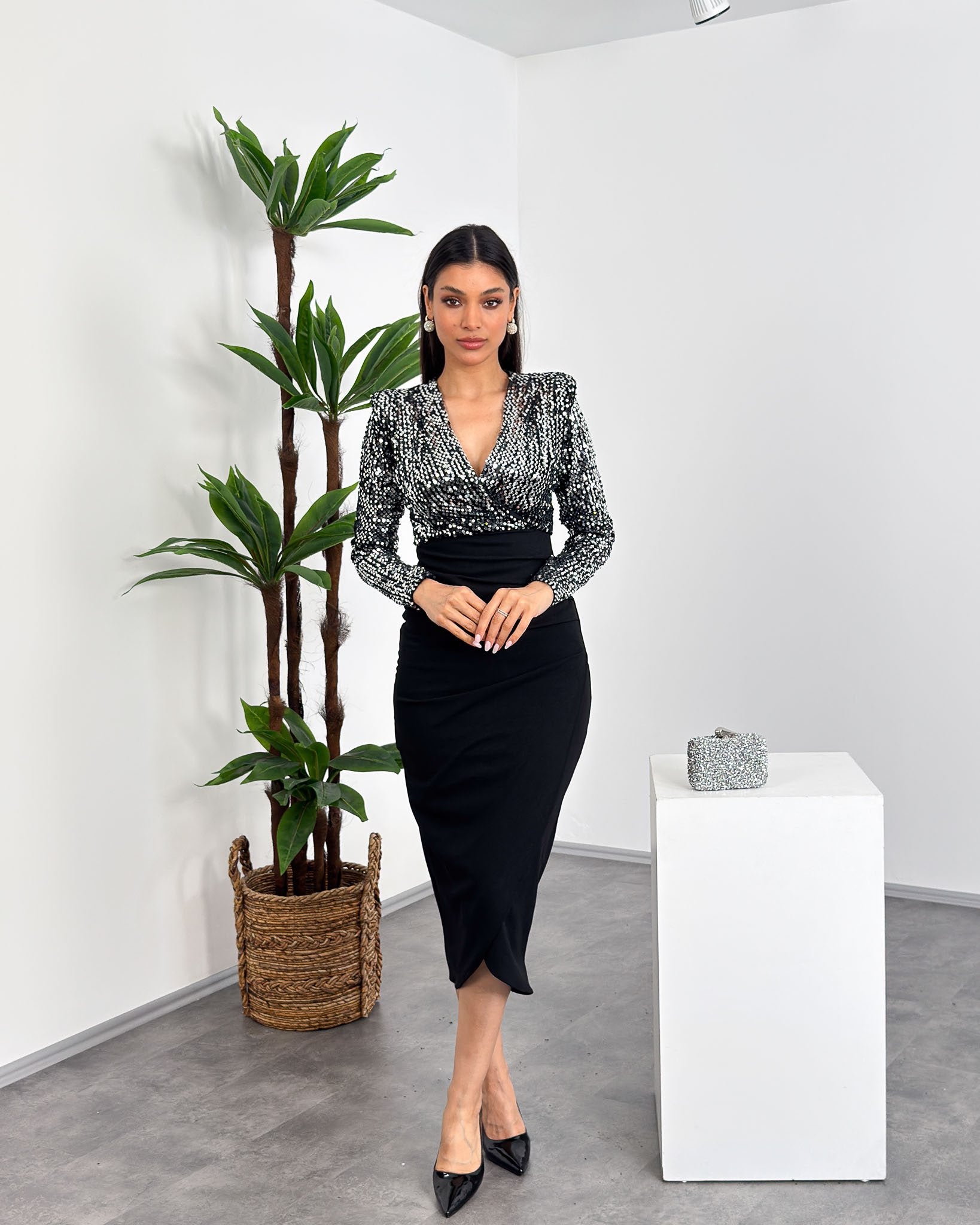 ML26018 Midi Dress with Sequin Details and Wrap Neckline