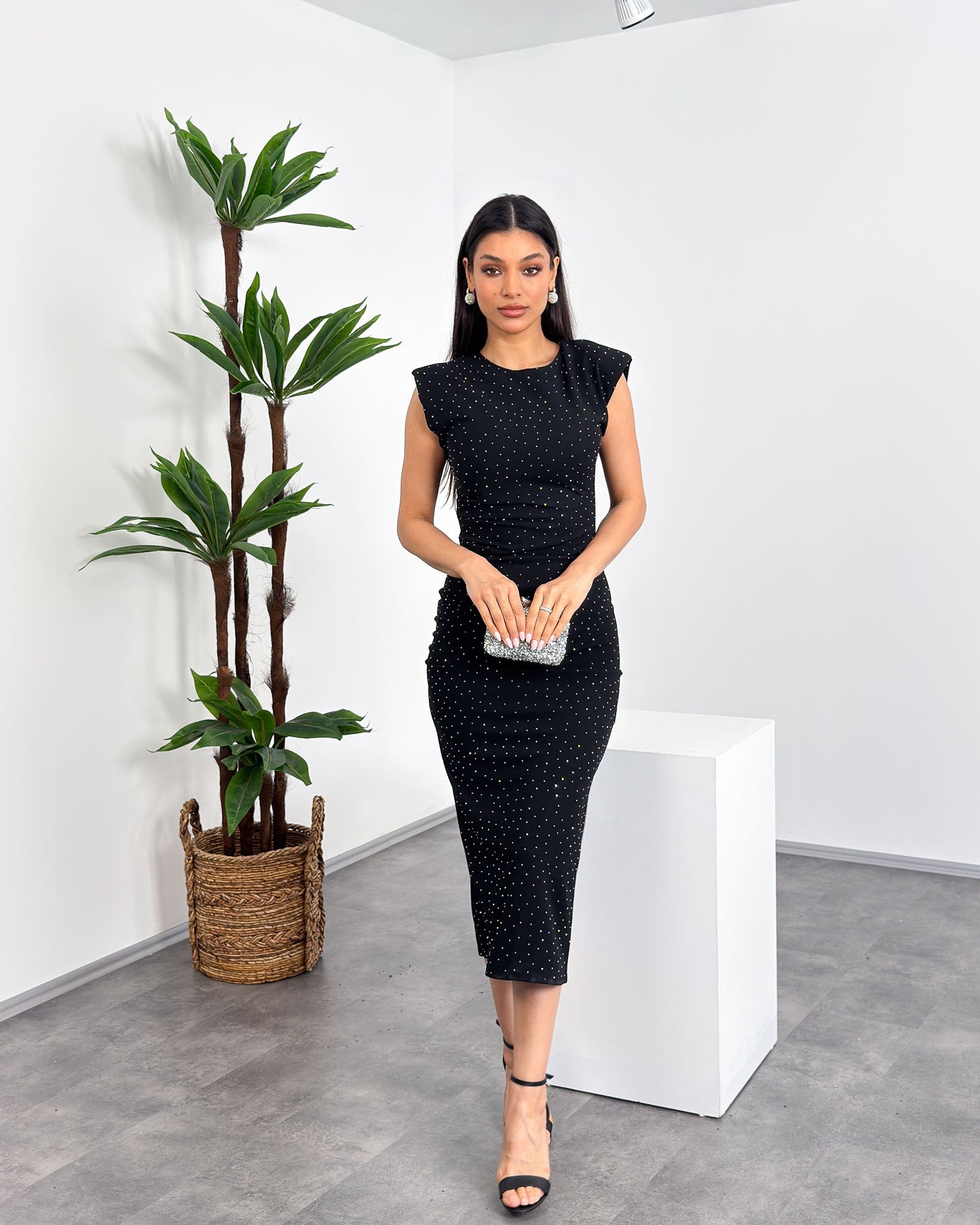 ML26017 Pencil Dress with Draped Design, Padded Shoulders and Stone Embellishments