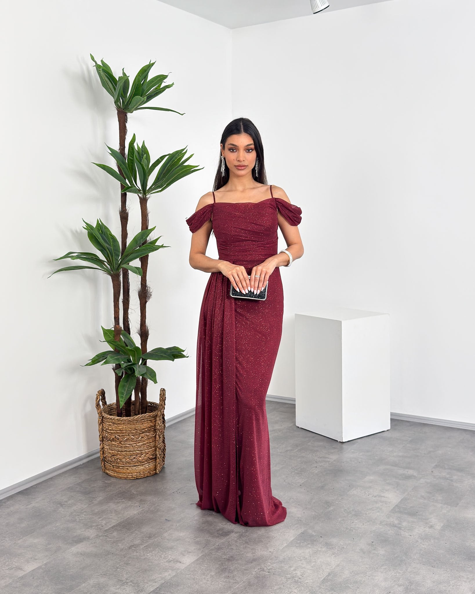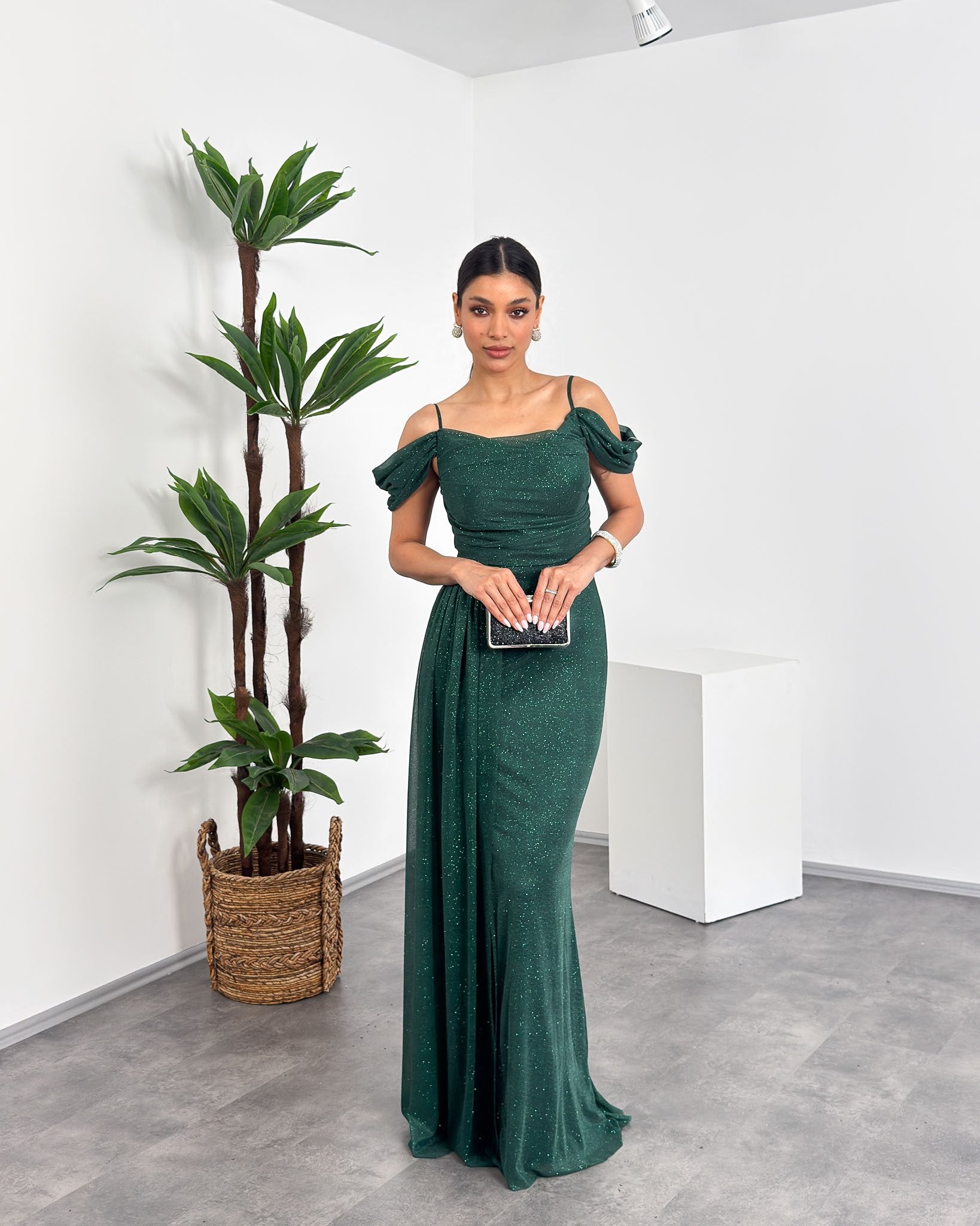 Zarafet ve feminen dokunuş bir arada! İp askılı ve düşük omuz detayıyla modern şıklığı yansıtan bu özel tasarım abiye, belden...