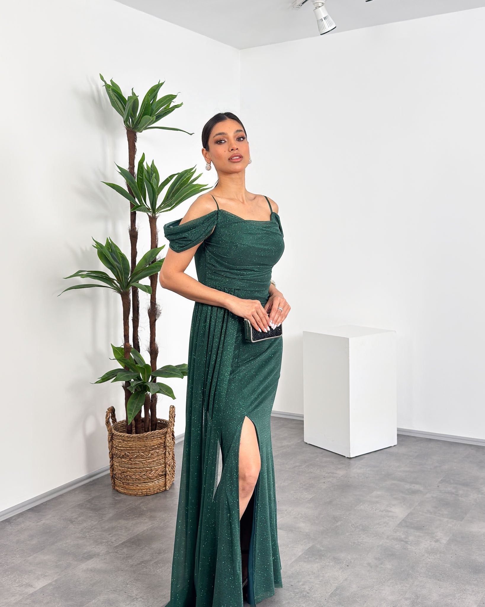 İp Askılı Düşük Omuzlu Drapeli Önden Yırtmaçlı Maxi Elbise